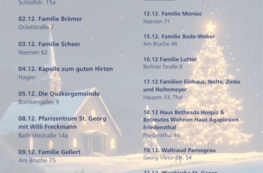 Auch in diesem Jahr lädt der „Lebendige Adventskalender“ zu einer besonderen Adventszeit ein. Familien und Einzelpersonen öffnen ihre adventlich gestalteten Fenster, Garagen, Carports oder ...