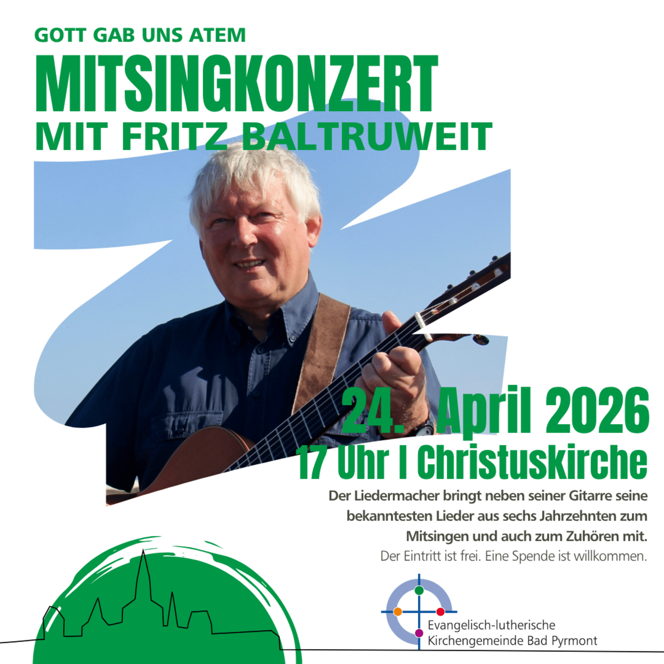 Am Freitag, den 24.4., um 17.00 Uhr laden wir ganz herzlich zu einem Mitsingkonzert mit Fritz Baltruweit ein.