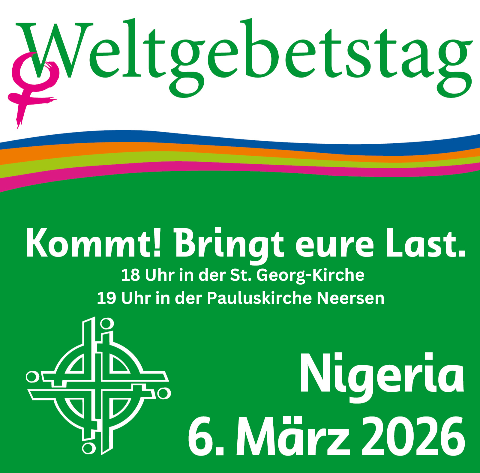 Am Freitag, den 6. März 2026, feiern Menschen in über 150 Ländern der Erde den Weltgebetstag der Frauen aus Nigeria. „Kommt! Bringt eure Last.“ lautet ihr hoffnungsverheißendes Motto, angelehnt an Matthäus 11,28-30.